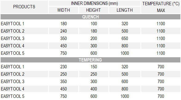 The EASYTOOL range offers the possibility of composing a complete heat treatment station, depending on production requirements, including heating furnace before quenching under controlled atmosphere, quenching tank and ventilated tempering oven. The dimensions and modules available allow it to adapt to both laboratory and teaching requirements and those of a production workshop. Many options available (washing, mechanization of loading, data acquisition, etc.).